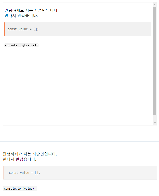 <p></p>태그가 붙게되어pre블록과code블록은 원하지 않는 형태로 나타납니다. 그렇기 때문에Shift + Enter키를 사용하여<br/>태그만 붙게 해주어 사용해야됩니다. -