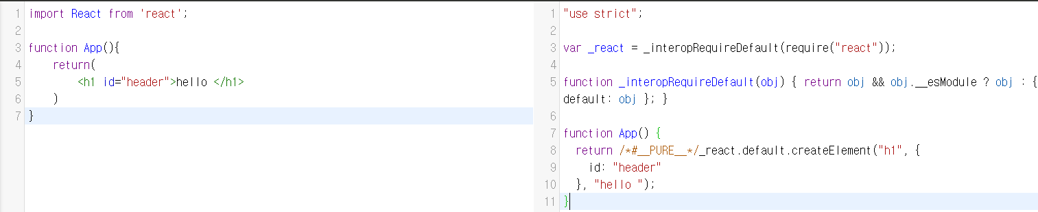 Babel 안에 있는 JSX transpiler가 오른쪽처럼 변환해준다.