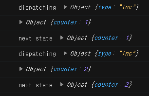 function dispatchAndLog(store, action) { console.log('dispatching', action); store.dispatch(action); console.log('next state', store.getState()); } // 로깅함수 호출 dispatchAndLog(store, { type: "inc" }); dispatchAndLog(store, { type: "inc" });이런식으로 로깅을 함수로 뽑아낼 수 있다.