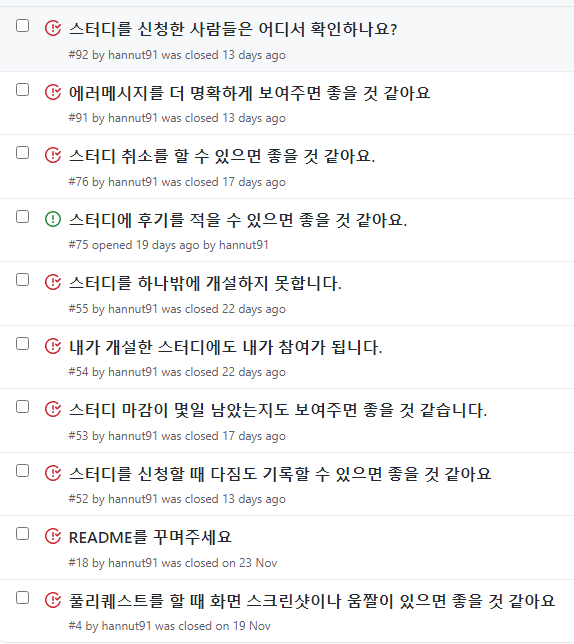 ํ๋ก์ ํธ๊ฐ ๋๋ ํ The Nature of Software Development ์ฑ ๊ณผ Clean Agile์ ์ฝ๊ณ ์คํฐ๋๋ฅผ ํ๊ณ ๋์ ๋ ํ์คํ ๊ทธ ์ด์ ๋ฅผ ์๊ฒ ๋์๋ค.- ๐ ๋ฐฐํฌ๋ ๋งค์ฃผ ๊ฒฐ๊ณผ๋ฌผ์ ๋ณด๊ณ issue๋ฅผ ๋ฌ์์ฃผ์ จ๋ ์ค์ ๋