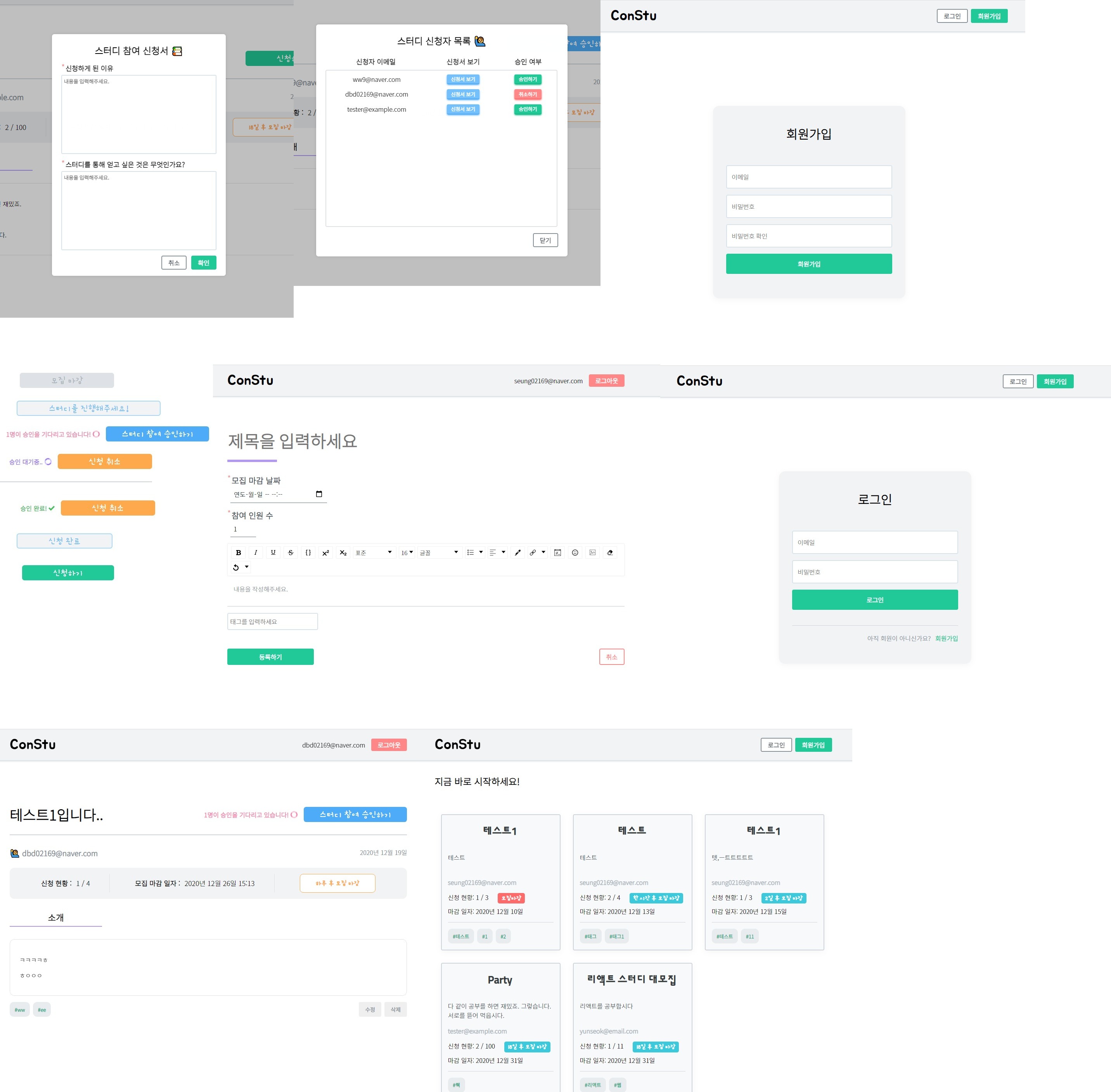 - ๊ธฐ๋ฅ์ผ๋ก๋ ๋ก๊ทธ์ธ, ํ์๊ฐ์ , ์คํฐ๋ ์๊ฐ๊ธ ์์ฑ, ์์ , ์ญ์ ์ ์คํฐ๋ ์ ์ฒญ์ ๋ฐ๋ฅธ ์ฌ์ฉ์ ์ํ ๋ฑ์ ๊ตฌํํ๋ค.