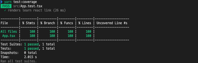 { // ... "scripts": { // ... "test:coverage": "yarn test --watchAll=false --coverage", } "jest": { // 이 두 파일을 제외해주는 이유는 이 파일들에 대한 테스트를 작성할 이유가 전혀 없기 때문입니다. "coveragePathIgnorePatterns": [ "src/index.tsx", "src/reportWebVitals.ts" ], // code coverage가 90프로 이하면 에러를 발생시킵니다. "coverageThreshold": { "global": { "branches": 90, "functions": 90, "lines": 90, "statements": 90 } } }, // ... }작성한 스크립트를 정상적으로 아래와 같이 실행해 하는지 확인해줍니다.
