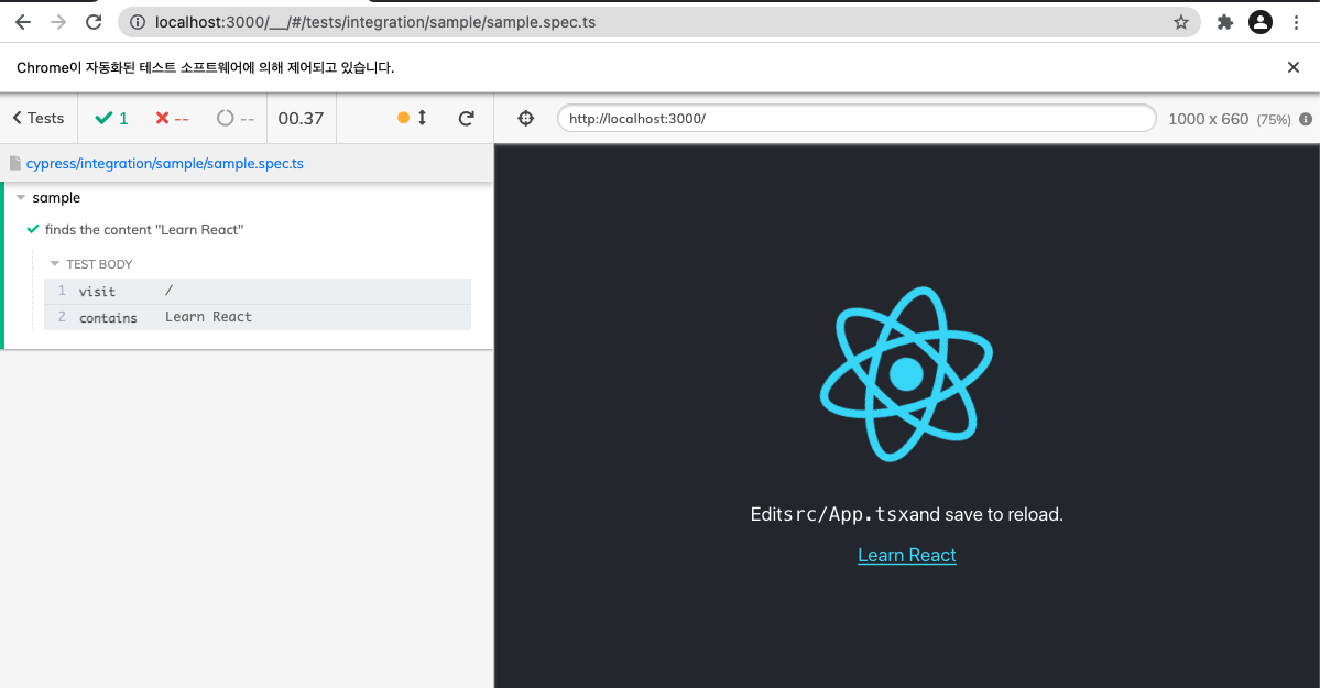 cypress/integration/sample폴더에sample.spec.ts에 다음과 같이 작성해줍니다.// sample.spec.ts describe('sample', () => { it('finds the content "Learn React"', () => { cy.visit('/'); cy.contains('Learn React'); }); });이제 개발 서버를 실행 후 Cypress e2e 테스트가 정상적으로 통과하는지 확인해봅시다.