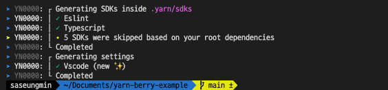 yarn dlx @yarnpkg/sdks vscode그 후 아래 사진과 같이 현재 프로젝트에 필요한 Editor SDK가 설치가 됩니다. Eslint와 TypeScript SDK가 설치되었습니다.