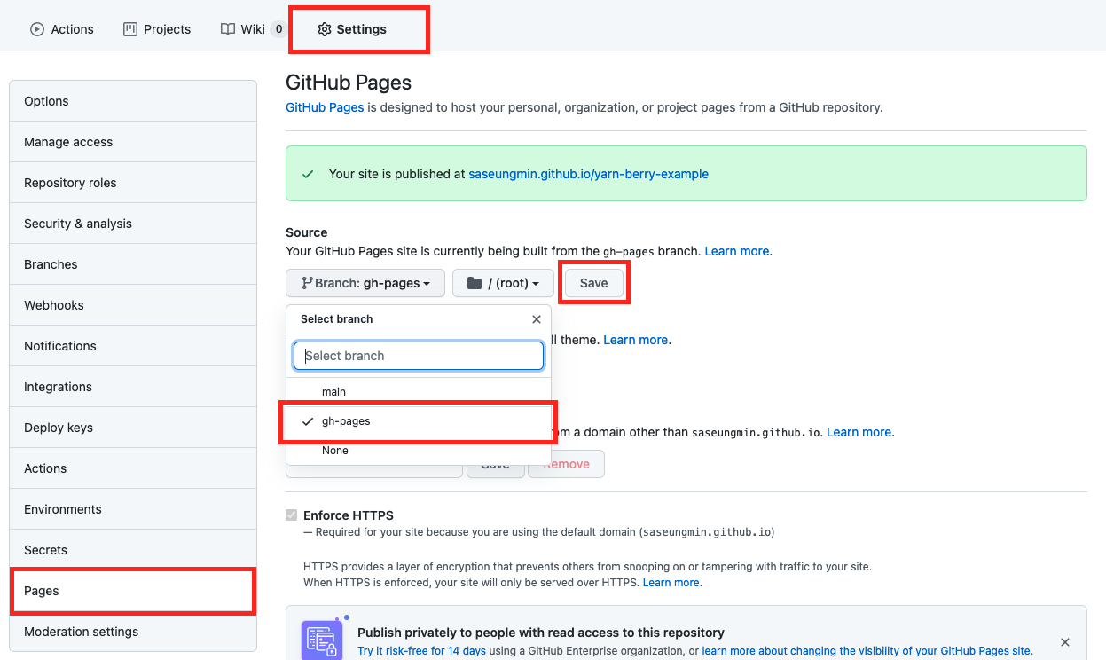 이제 아래 사진과 같이 Github Repository에 Settings 탭의 Pages 섹션으로 이동해서 Source의 gh-pages를 선택 후 Save 버튼을 눌러 저장합니다.
