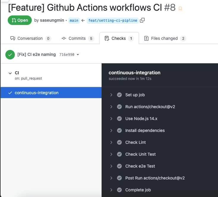ci.yml의 전체 코드입니다.name: CI on: pull_request: branches: [main] jobs: continuous-integration: runs-on: ubuntu-latest steps: - uses: actions/checkout@v2 - name: Use Node.js 14.x uses: actions/setup-node@v1 with: node-version: 14.x - name: Install dependencies run: yarn install --immutable --immutable-cache - name: Check Lint run: yarn lint - name: Check Unit Test run: yarn test:coverage - name: Check e2e Test uses: cypress-io/github-action@v2 with: install: false command: yarn test:e2e이제 여태까지 작업 된 내용들을 Github Repository의 main 브랜치로 Pull Request를 보내 Github Actions CI 파이프라인이 아래 사진과 같이 정상적으로 동작하는지 확인해봅시다.