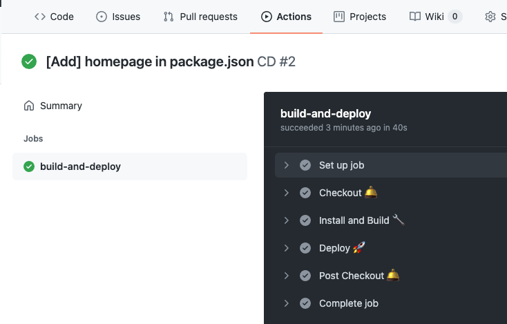 .github/workflows폴더 안에cd.yml을 작성해 줍니다.name: CD # main 브랜치로 push될 때만 동작한다. on: push: branches: - main jobs: build-and-deploy: runs-on: ubuntu-latest steps: - name: Checkout 🛎️ uses: actions/checkout@v2.3.1 - name: Install and Build 🔧 run: | yarn install --immutable --immutable-cache yarn run build - name: Deploy 🚀 uses: JamesIves/github-pages-deploy-action@4.1.5 with: branch: gh-pages # 빌드되는 폴더명 folder: build한가지 주의사항으로 create-react-app을 사용한 React 프로젝트는 기본적으로 루트(