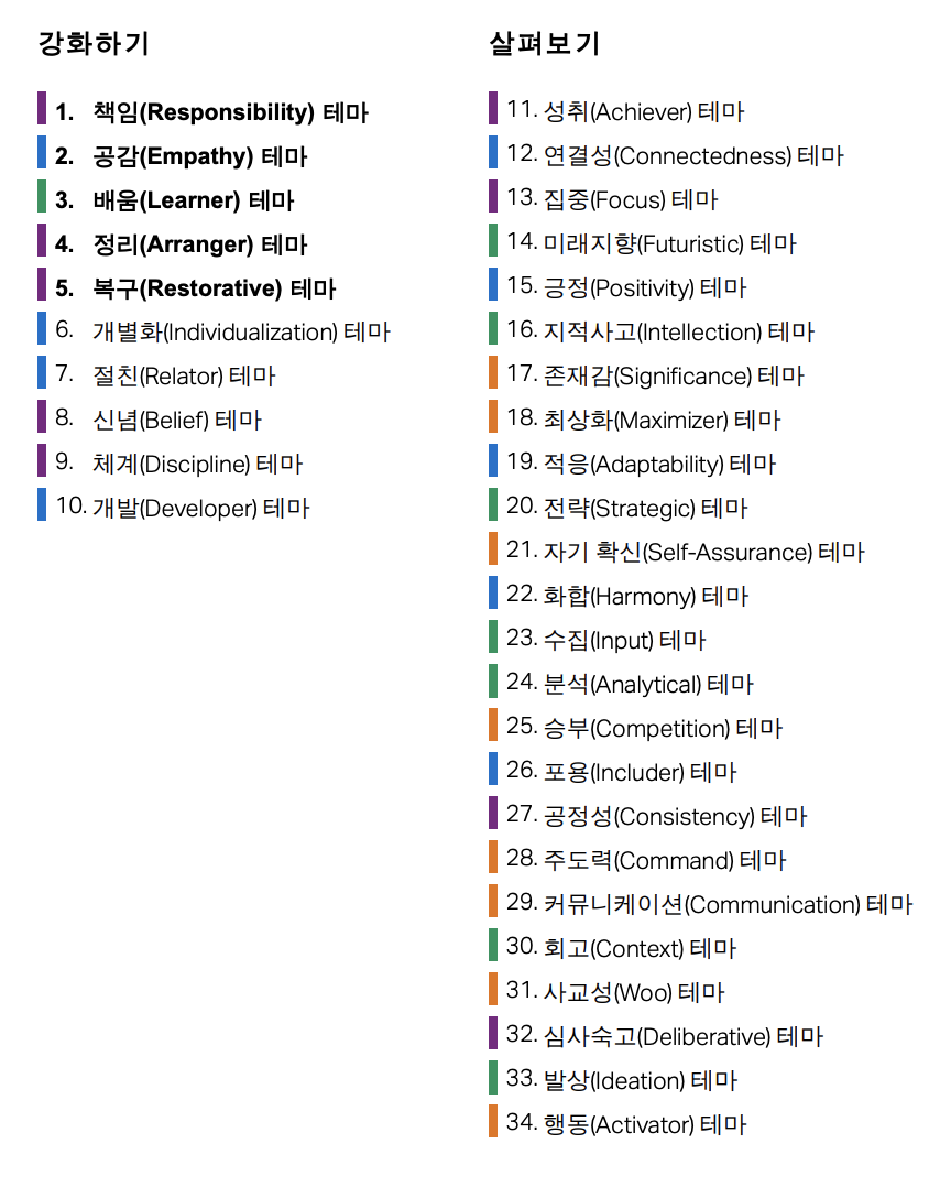 항상 단점만 찾아다녔었는데 내가 갤럽 강점 검사를 통해 내 강점에 대해서 알게 되었다는 점이다. 가격이 비싸서 회사에서 갤럽 강점 검사를 하자고 제안을 했었고 프로덕트 전체 인원이 함께 하루 날 잡고 회고 시간에 진행하게 되었다. 이 시간을 통해서 나의 강점을 알게 되었는데 가장 큰 강점은 책임감이 미친 듯이 높다는 것이다. 그리고 두 번째는 공감하는 능력. 세 번째가 배움이었다.