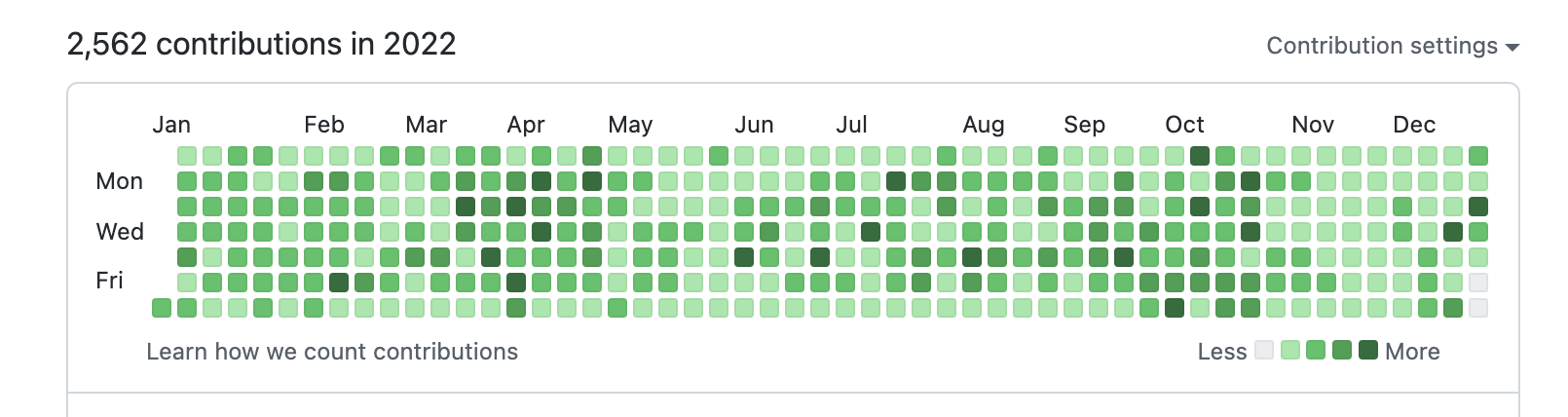 Daily commit은 여전히 꾸준하게 유지하고 있다. 올해 daily commit 2년 차가 되어서 회고도 작성했었다. 작년에 힘들면 그만두겠다고 했었는데 아직까지는 할만하다. 역시 습관이 되기까지가 어려운 거지 습관이 되면 매일 양치를 하는 것처럼 당연히 해야 할 일 중에 하나로 바뀌는 것 같다.(근데 요즘에는 이런 습관을 가지는 게 좋은 걸까라는 의문이 들기도 한다...) 내 기준에서는 행동이 습관이 되기까지 길어봐야 약 3달 정도였던 것 같다.