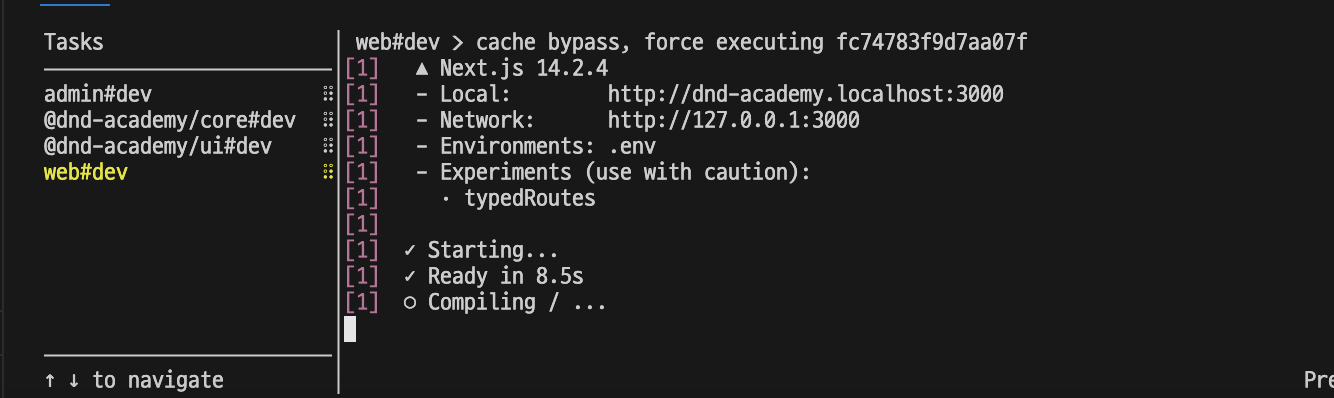 모노레포 도구는 vercel에서 만든 turborepo를 사용했었는데, 이전에 사용했던 경험도 있고 개발자 경험이 좋았고 원격 캐시 기능도 있어서 빠른 빌드를 할 수 있어서 좋았다. 버전 2.0에서는 터미널 UI가 개선되었는데 꽤나 이쁘다...