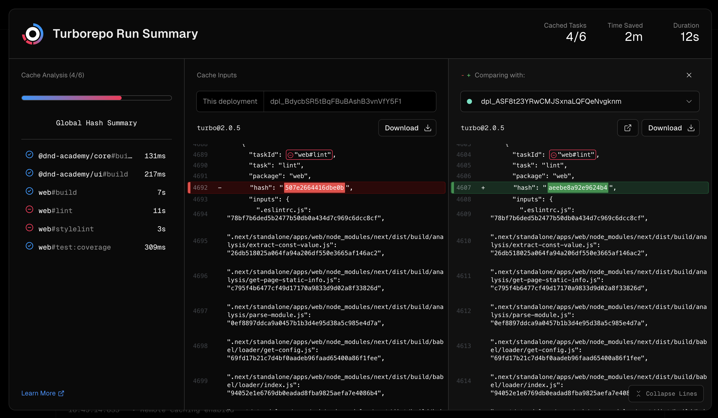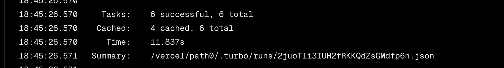 turborepo를 사용한 vercel deploy로그에서는 run summary를 통해 가시적으로 확인도 가능했고, 총 2분 12초의 소요시간이 걸리는 작업에 2분의 시간을 절약하고 12초가 걸린 것을 확인해 볼 수 있었다.