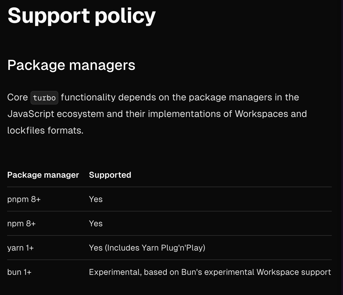 // .yarnrc.yml nodeLinker: node-modulesturborepo의 버전이 v1 초반에서는 공식적으로 지원하지 않았었고, turborepo의 메인테이너분께서PnP의 지원을 계획하지 않는다고 하셨던 걸로 알고 있었는데 버전이 업데이트되면서 PnP의 기능은 동작하도록 업데이트된 것 같았다.