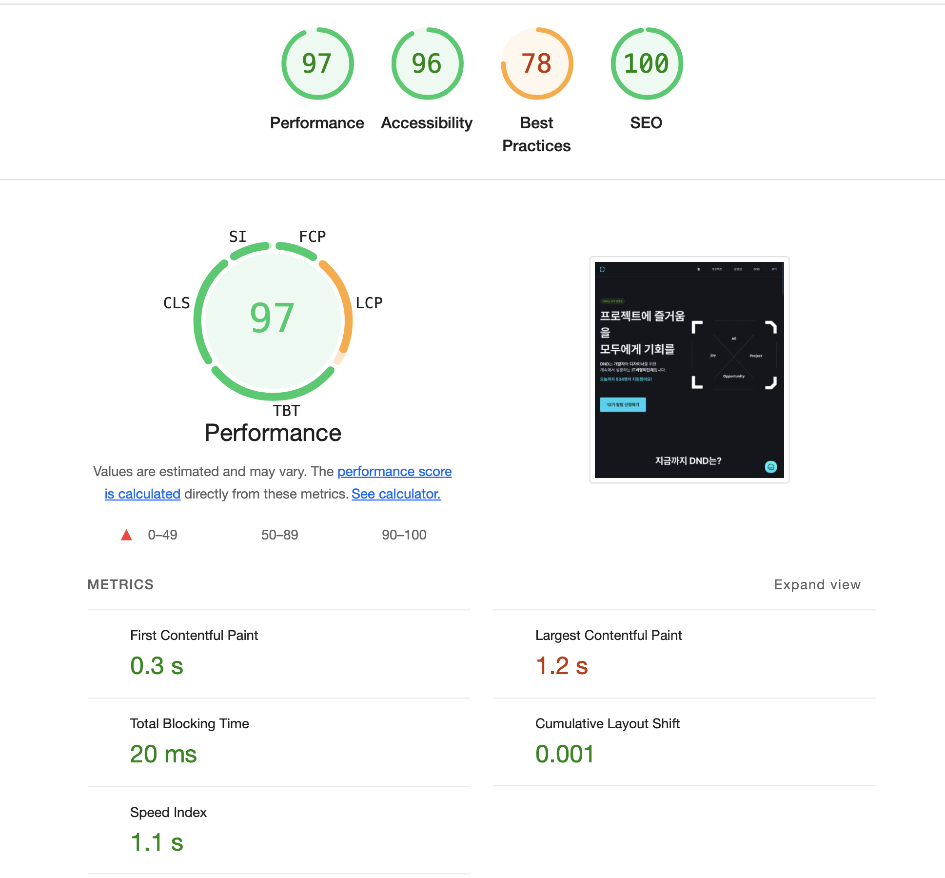 위 lighthouse 지표에 Best Practices의 점수가 높지 않은 이유는 dnd에 문의 사항 창구로 채널톡을 사용하고 있는데 best practices 항목에 서드 파티 쿠키의 영향을 받아서 그런 것 같다. 이 부분은 내가 고려해야 할 사항은 아닌 것 같다.