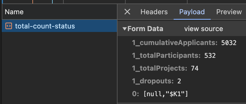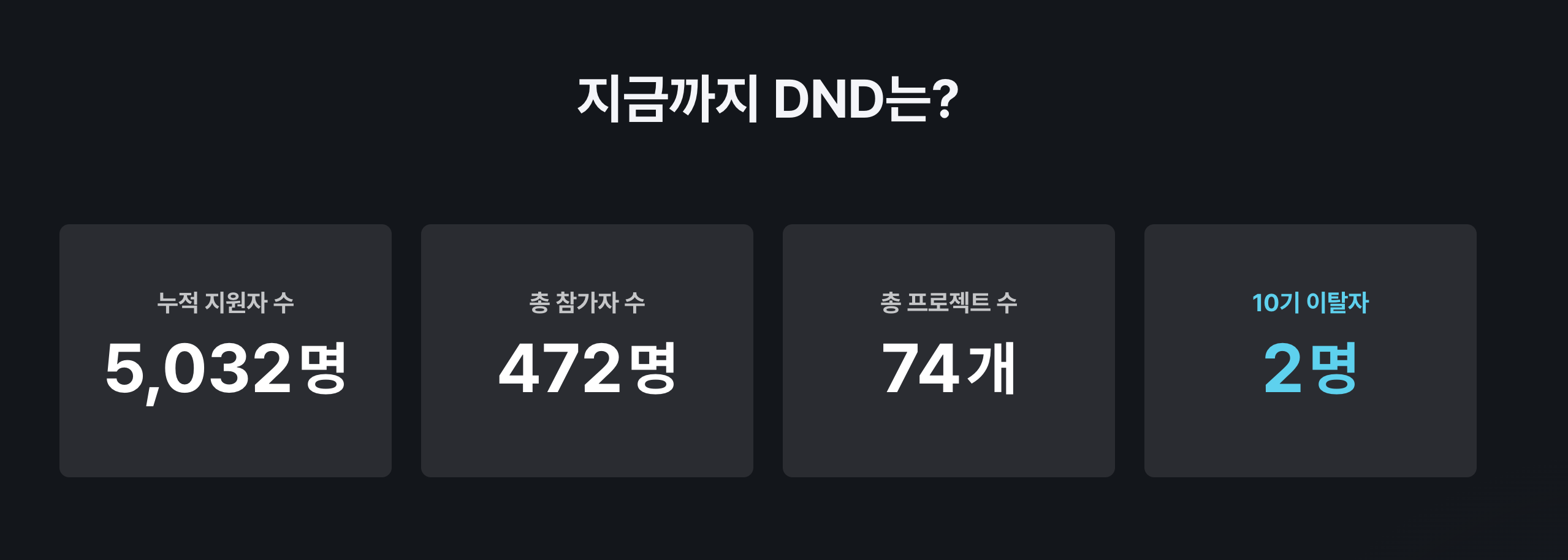 홈페이지에 다음과 같은 누적 지원자 수, 총 참가자 수, 총 프로젝트 수, 이탈자 수를 보여주는 섹션이 있다. 이 섹션은 매 기수 진행될 때마다 json파일 데이터를 수동으로 수정해서 직접 업데이트를 해주고 있었다.