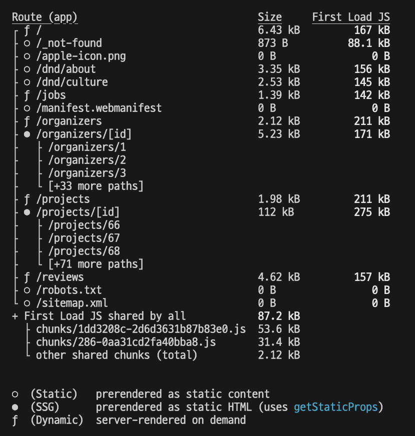 dnd 홈페이지를 build 한 내용인데 확인해보면 데이터 패칭이나 동적 함수를 사용하지 않은 소개 페이지인 /dnd/about, /dnd/culture 페이지는 정적 콘텐츠로 사전 렌더링된 것으로 확인해 볼 수 있었다.