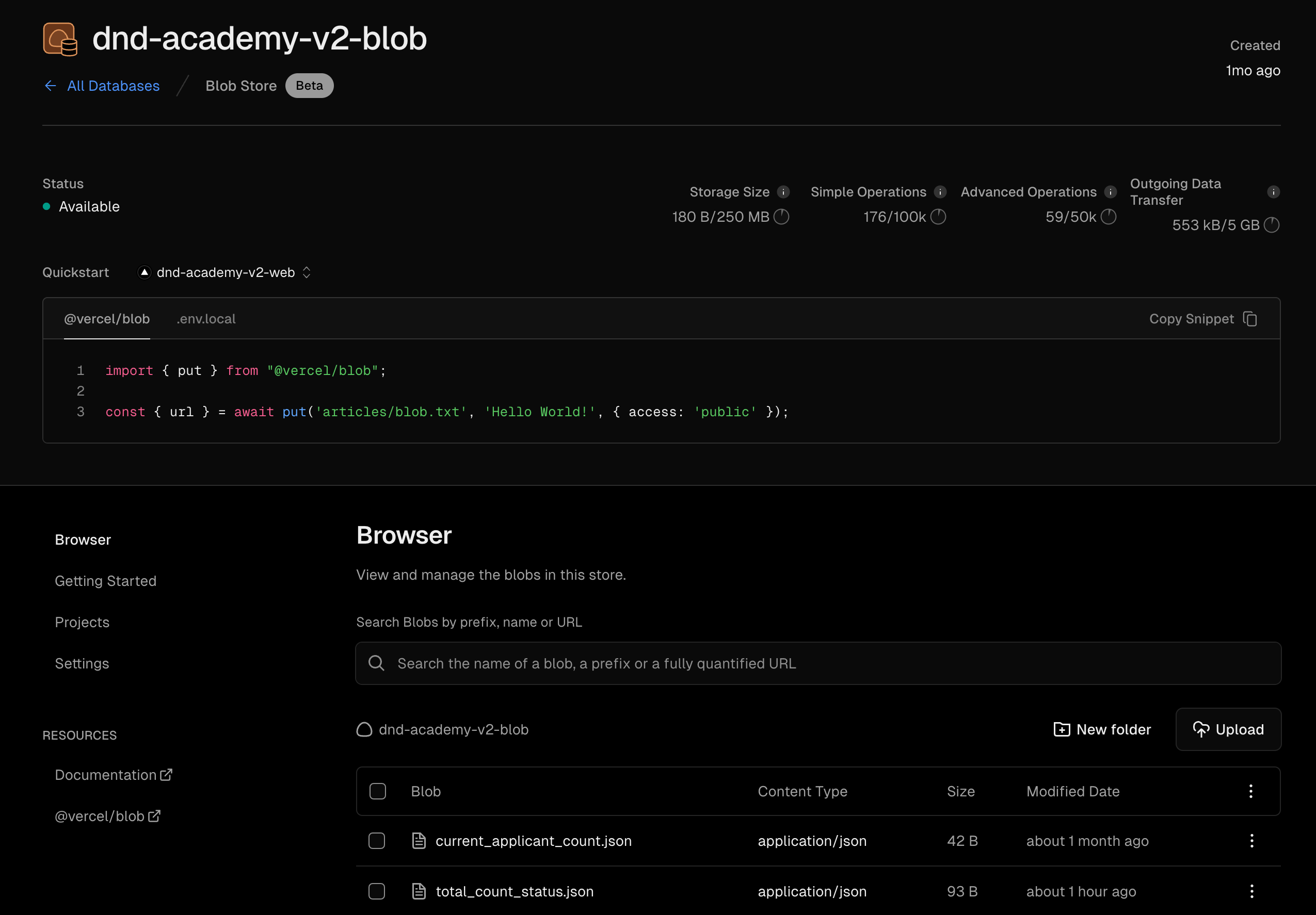 'use server'; import { revalidatePath } from 'next/cache'; import { put } from '@vercel/blob'; export async function totalCountStatusAction( _: TotalCountStatusStateType | null, formData: FormData, ): Promise<TotalCountStatusStateType> { /* ... */ await put('total_count_status.json', requestBlob, { access: 'public', token: process.env.DND_ACADEMY_V2_BLOB_READ_WRITE_TOKEN, addRandomSuffix: false, }); /* ... */ }vercel storage dashboard에서 blob 정보를 확인할 수 있다.