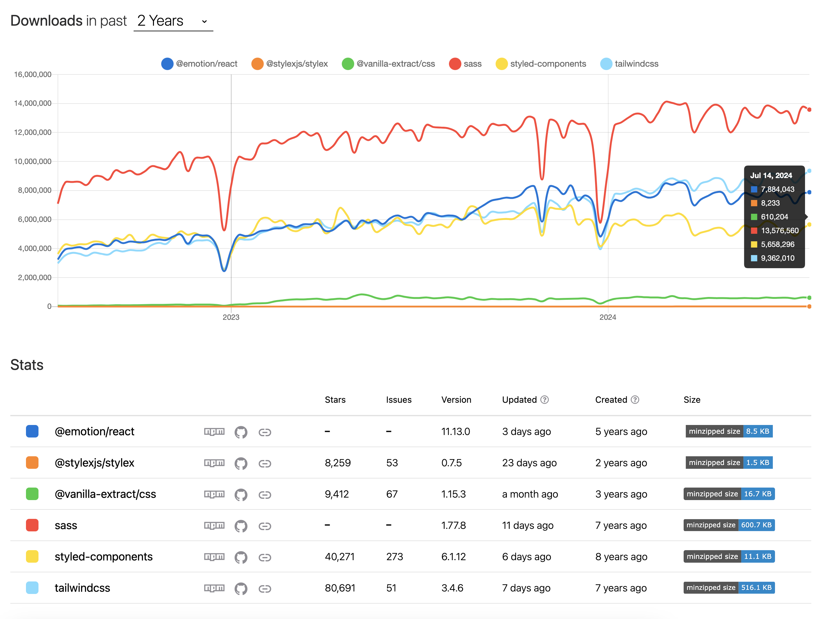 두 번째 이유로는 css-in-js에서 느꼈던 좋았던 장점들과 개발 생산성이 뛰어나다는 점이 있었지만, 결국은 styled-component나 emotion처럼 언젠가는 또 바뀔 것 같은 불확실함이 컸던 것 같다. 빠르게 변하는 프론트 생태계에서 또 다른 좋은 라이브러리들이 생겨 마이그레이션 하는 과정이 지친다고 해야 할까...? 확실히 느꼈던 계기가 회사에서 styled-component를 사용하고 있었고 next.js에서 app router로 전환하기 위해서 모든 styled-component를 걷어낼 수밖에 없었던 명확한 이유와 사용하고 있는 모든 곳에서 걷어내며 통합 테스트를 한 과정이 그렇게 쉽지만은 않았다는 점에서 지칠 때로 지쳐버렸던 게 아닐까 싶었다.세 번째로 고려했던 tailwind css이다. tailwind css는 사용하기 전에는 className이 길어지는 점과 react 컴포넌트의 tag의 className에 인라인 스타일과 같이 적용되어 있어서 관심사가 분리되어있지 않아 가독성이 좋지 않은 점으로 인해서 개인적으로 선호하지 않았다. 하지만 사용하기 전까지는 모른다고 직접 사용해보니 느꼈던 장점은 일관성 있는 디자인 시스템을 적용할 수 있으며 개발 생산성 또한 css나 style블록으로 이동하지 않아도 돼서 매우 좋았고, shadcn, nextui와 같은 ui 라이브러리에서 tailwind css를 기본적으로 사용하고 있다는 점도 활발한 생태계를 입증하고 있었다.