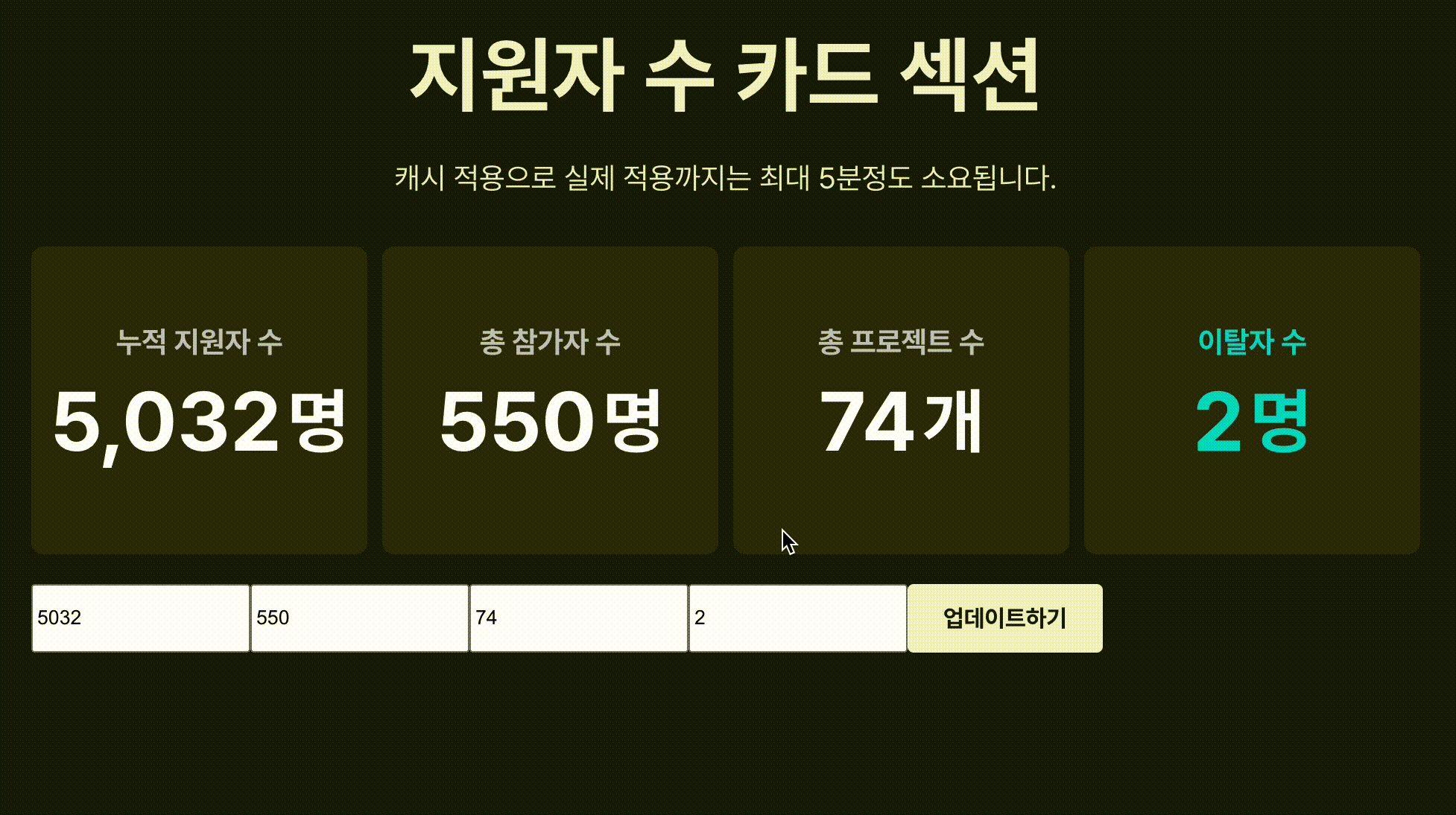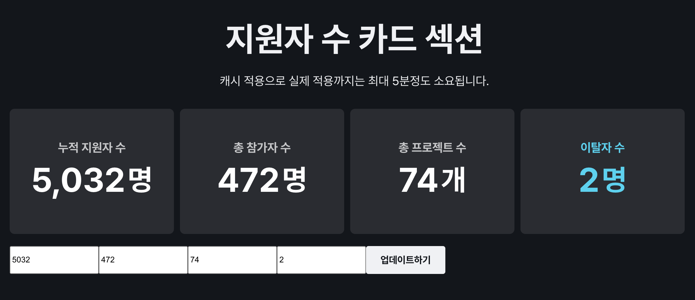홈페이지에 다음과 같은 누적 지원자 수, 총 참가자 수, 총 프로젝트 수, 이탈자 수를 보여주는 섹션이 있다. 이 섹션은 매 기수 진행될 때마다 json파일 데이터를 수동으로 수정해서 직접 업데이트를 해주고 있었다.