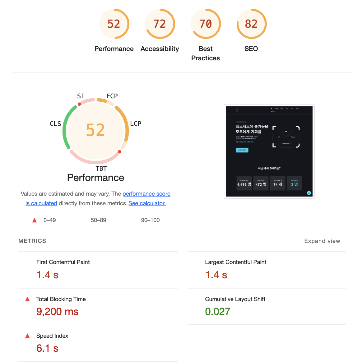 lighthouse로 성능 측정해 보았을 때 역시 그렇게 좋은 점수는 아니였다. 이러한 이유로 마이그레이션 하기로 결정하게 되었다.